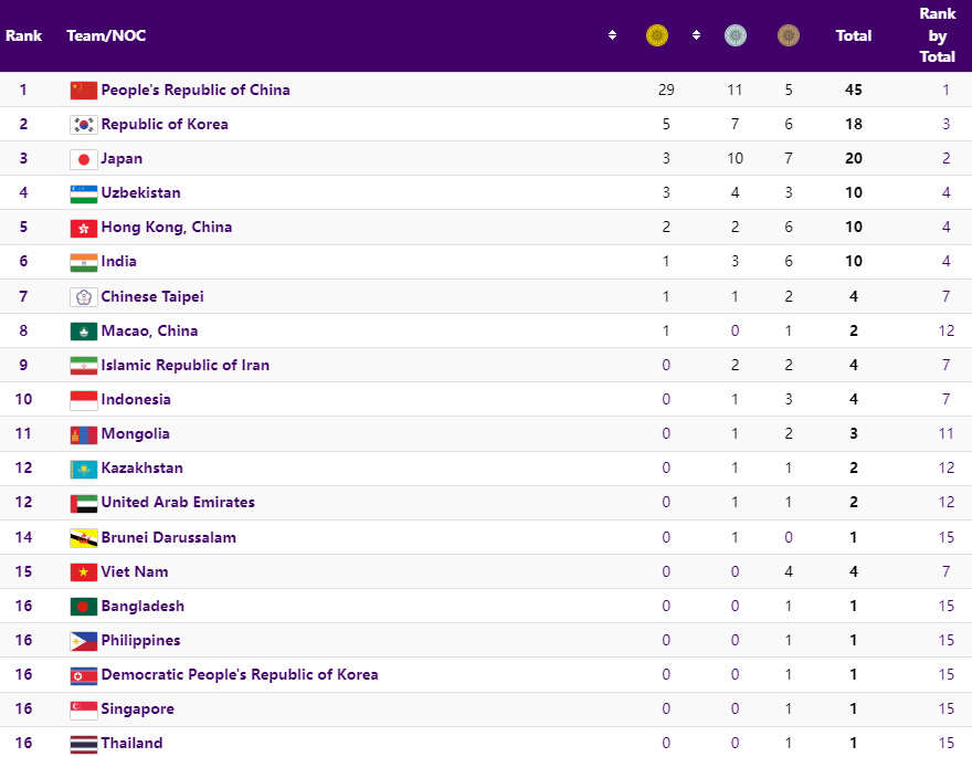 9월 25일 오후 15시 40분 메달 순위는 다음과 같습니다.