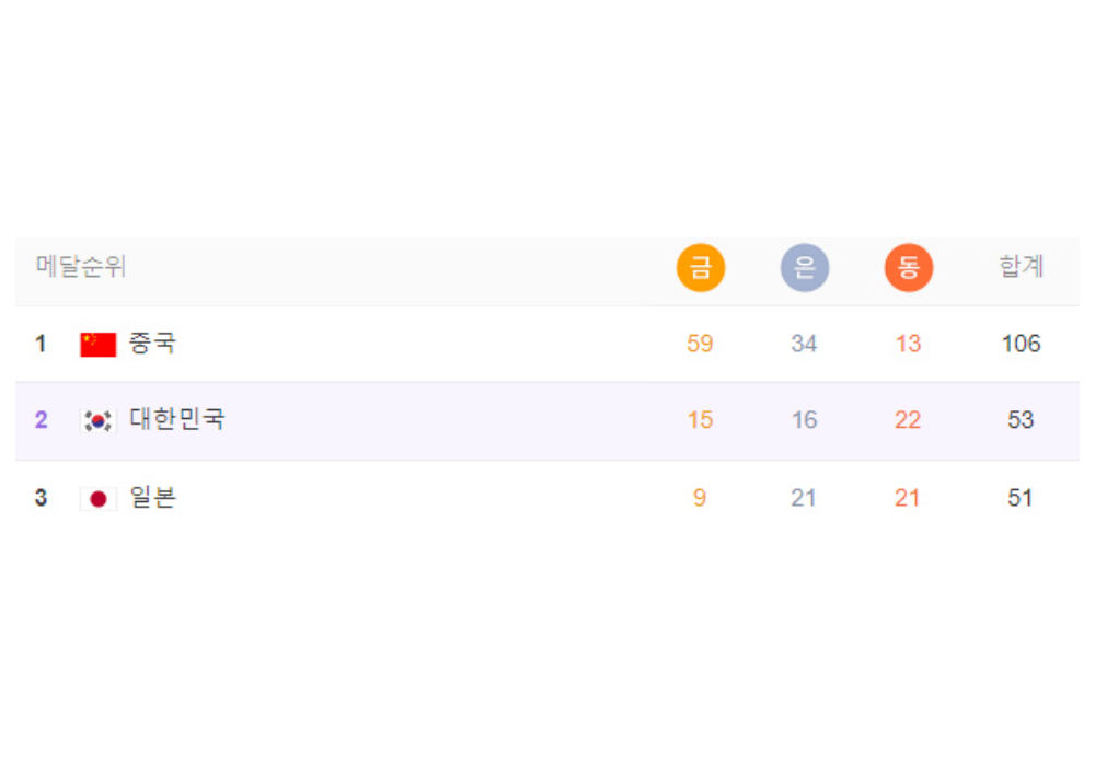 9월 27일 수요일 14시 기준 한국 메달 순위입니다.