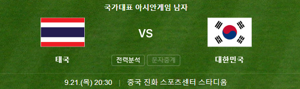 오늘 9월 21일 20시 30분 아시안게임 남자축구 조별리그 E조 2차전 한국과 태국 경기가 있습니다.