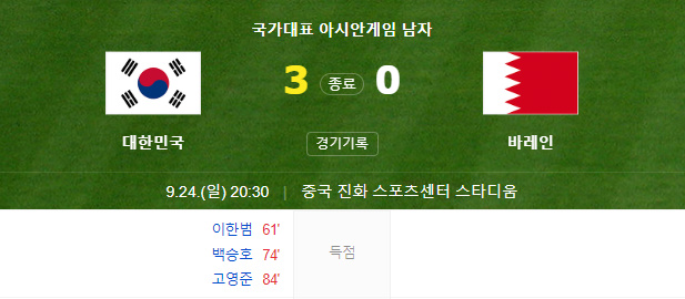 이번 아시안게임에서 우리나라 남자축구 대표팀은 좋은 소식만 안겨주고 있어서 너무 자랑스럽습니다. 이 좋은 기세 계속 이어서 16강전에서도 꼭 좋은 결과 있기를 바랍니다.