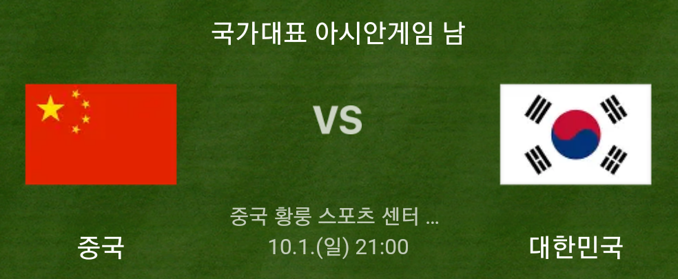 대한민국과 중국의 경기가 10월 1일 일요일 21시 황룽 스포츠센터 스타디움에서 열립니다.