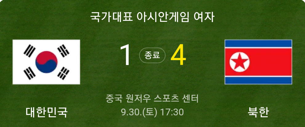 아시안게임 여자축구 북한과의 경기는 1대4로 대한민국이 패하였습니다.