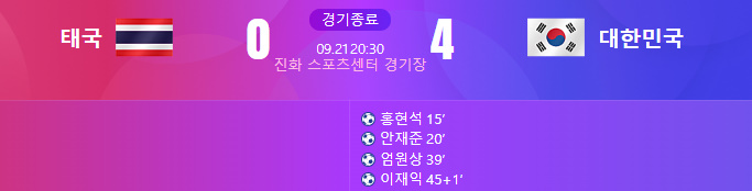 항저우 아시안게임 남자 축구 E조 예선 2차전에서 4대 0의 대승을 거두었습니다. 우리나라 축구대표팀은 1차전 쿠웨이트와 2차전 태국을 제압하면서 조 1위를 확정해 3차전 바레인과의 경기 결과에 상관없이 16강 진출을 확정지었습니다.