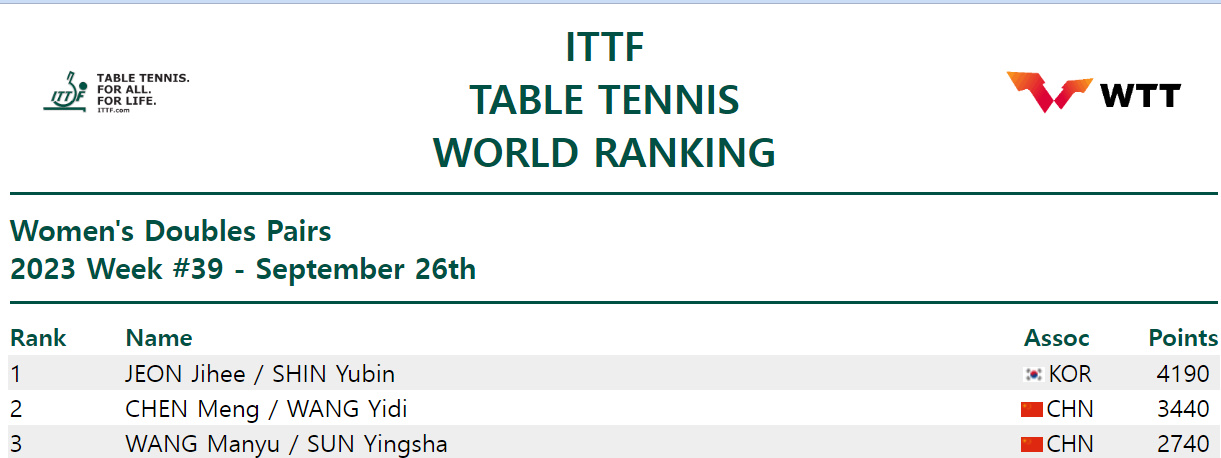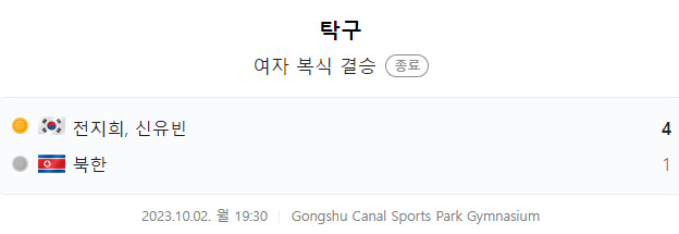 국제탁구연맹(ITTF) 여자복식 랭킹 1위인 전지희-신유빈 조는 10월 2일 19시 30분 항저우 공슈윈허 체육공원 체육관에서 열린 아시안게임 여자복식 결승 북한과의 경기에서 4대1로 이기며 금메달을 목에 걸었습니다.