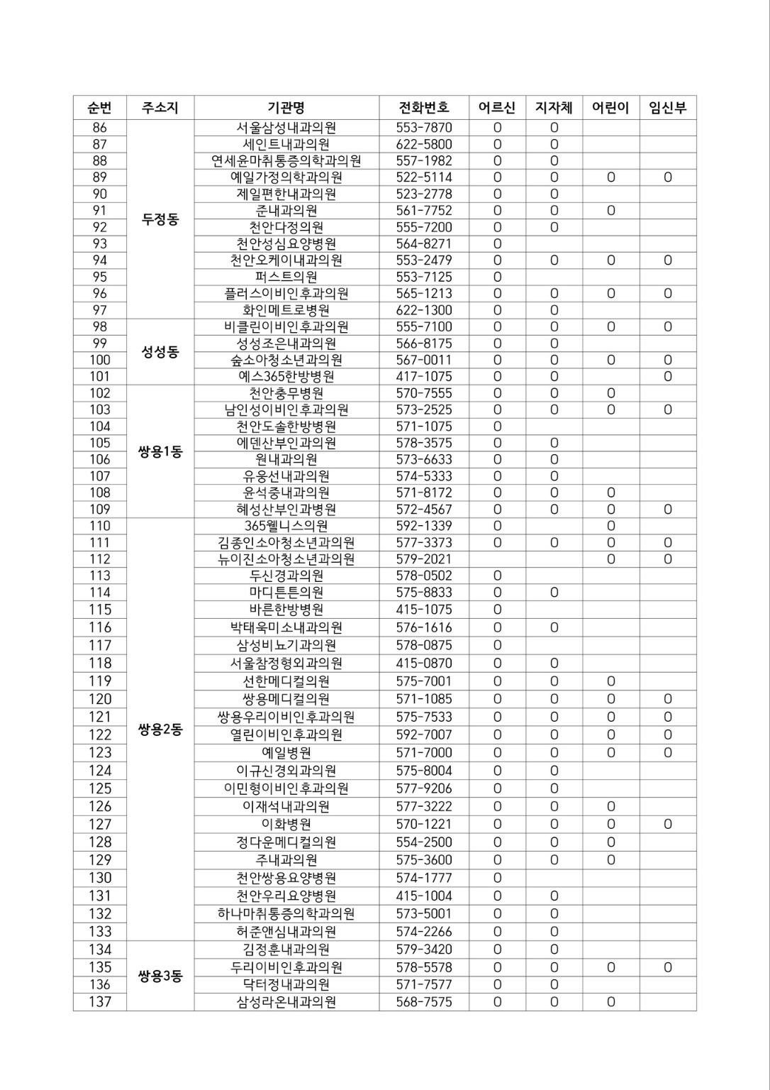 천안시 독감 예방접종 지정 의료 기관 리스트