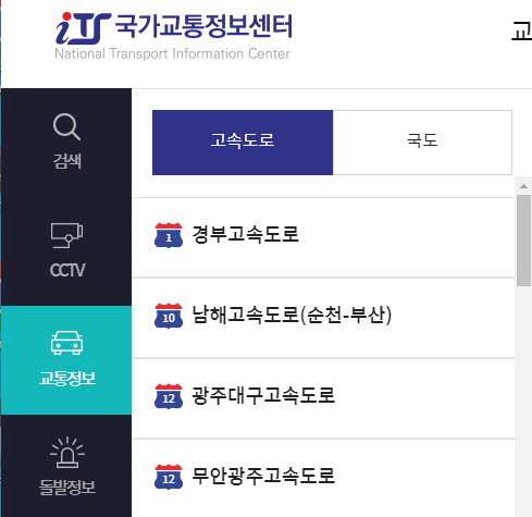 위에 ITS 국가교통정보센터 바로가기에서 실시간 도로 교통상황 외 CCTV, 우회도로 안내 등 도로정보를 확인하실 수 있습니다.