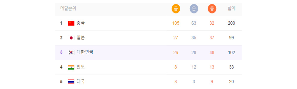 아시안게임 실시간 메달 순위 확인하기
